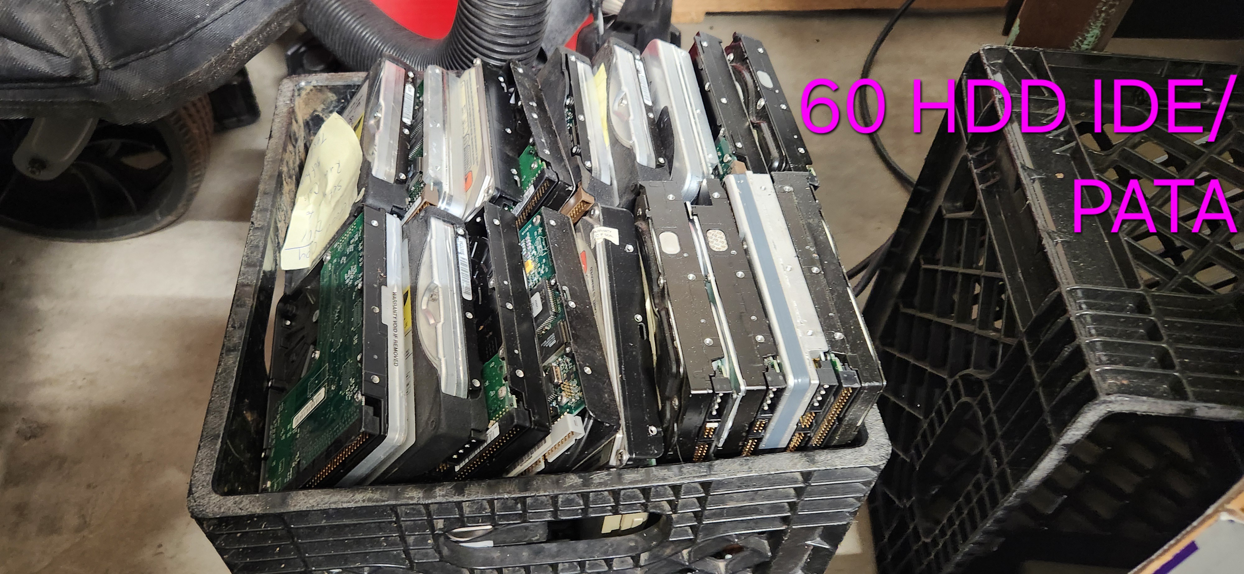 File comment: Milk crate of 60+ IDE HDDs