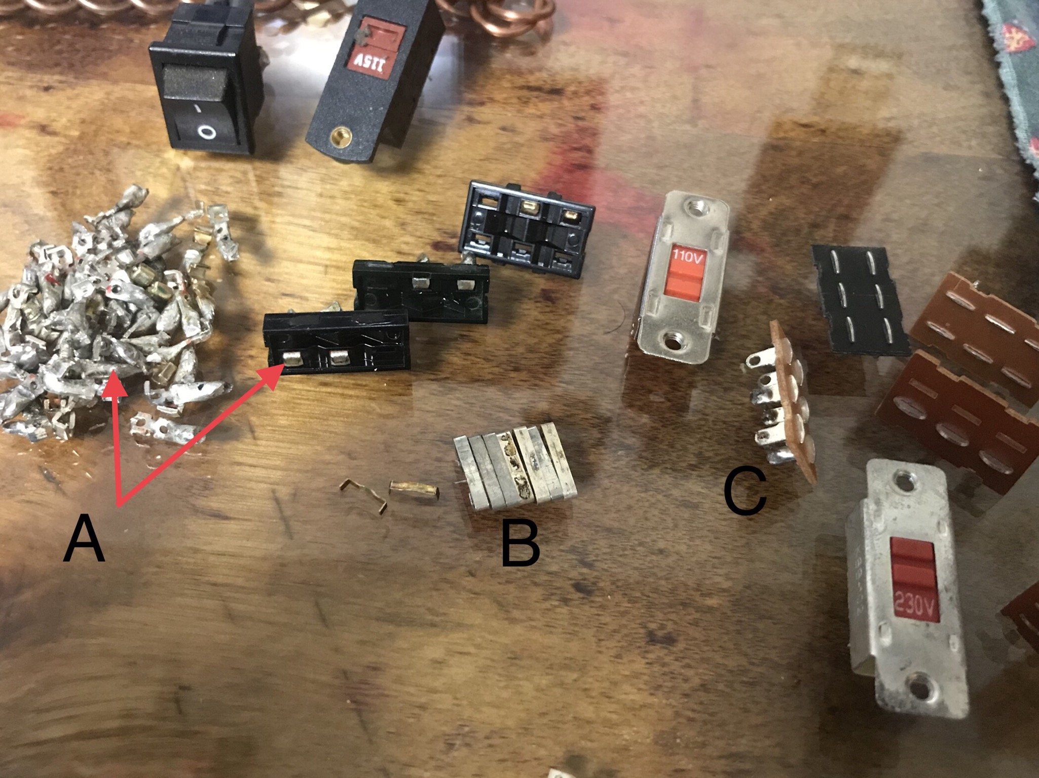 Voltage switches from PSUs, that I took apart. Most of these were the "A" type. The leads for soldering wire to (labeled "A") look like they're nickel plated copper. The stubby e-shaped pieces labeled "A" look like they could be silver plated copper.