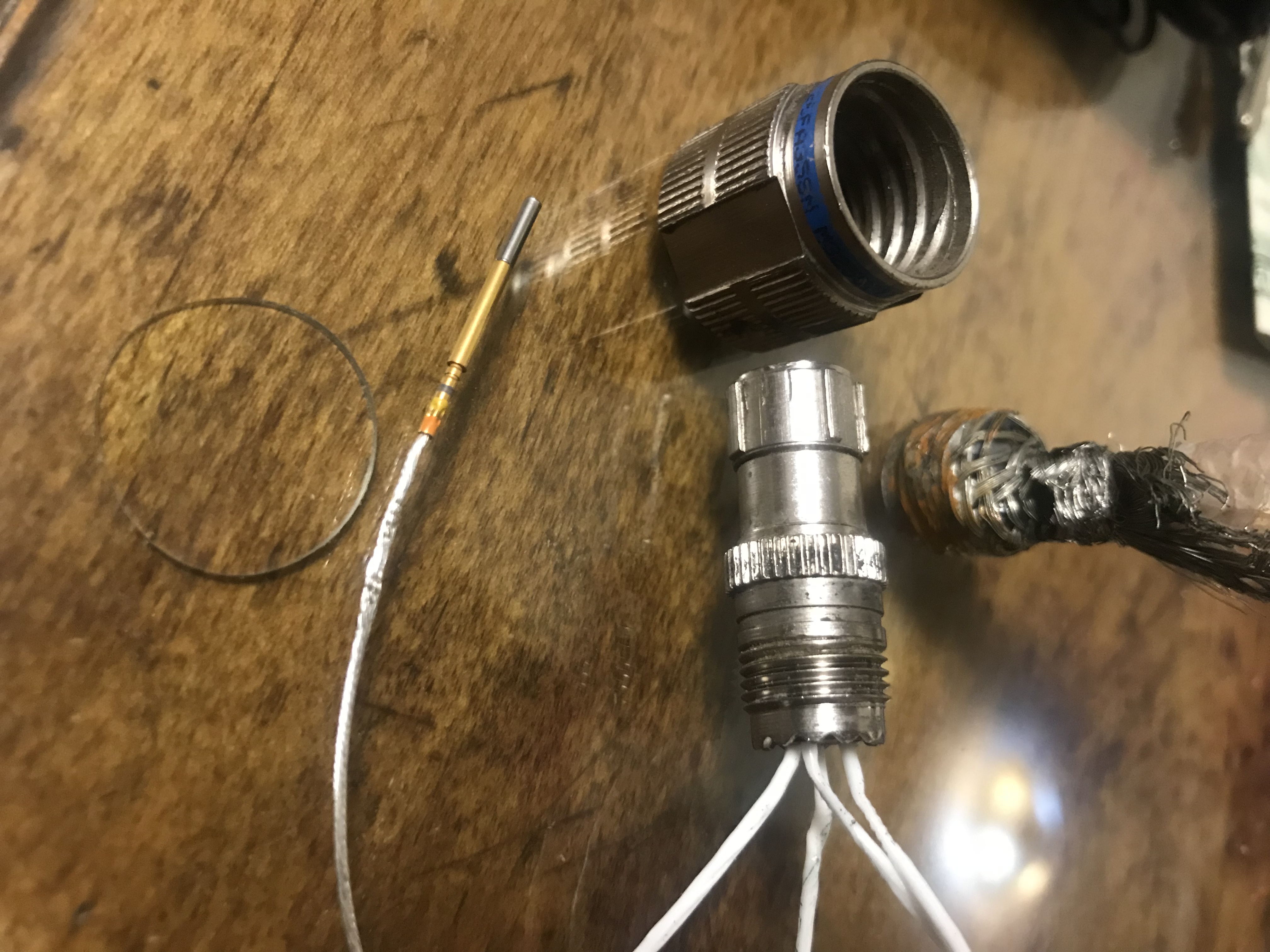 Last picture, or first if I uploaded in the wrong order... Is a military cable connector of some sort??? I think someone told me there's often silver wiring in stuff like this, I have no idea if that's true but the wire here definitiely isn't copper. Is it silver?