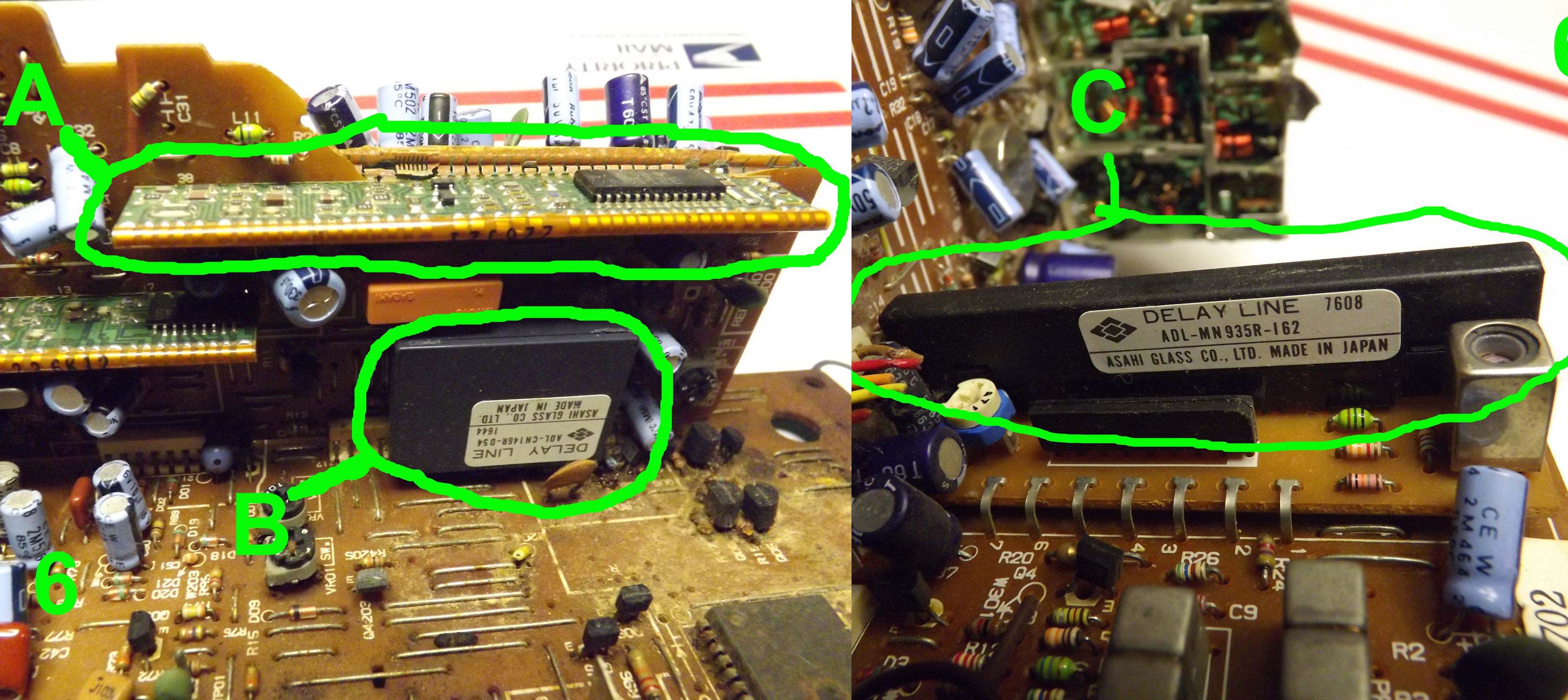 6.)Assuming low, possibly mid grade board but have a couple questions. More curiosity than anything else, but what are parts A, B and C? I know a tiny bit about electronic components but havent seen these. A puts me in mind of a memeory module. Is it something I should cut off and throw in a better category?
