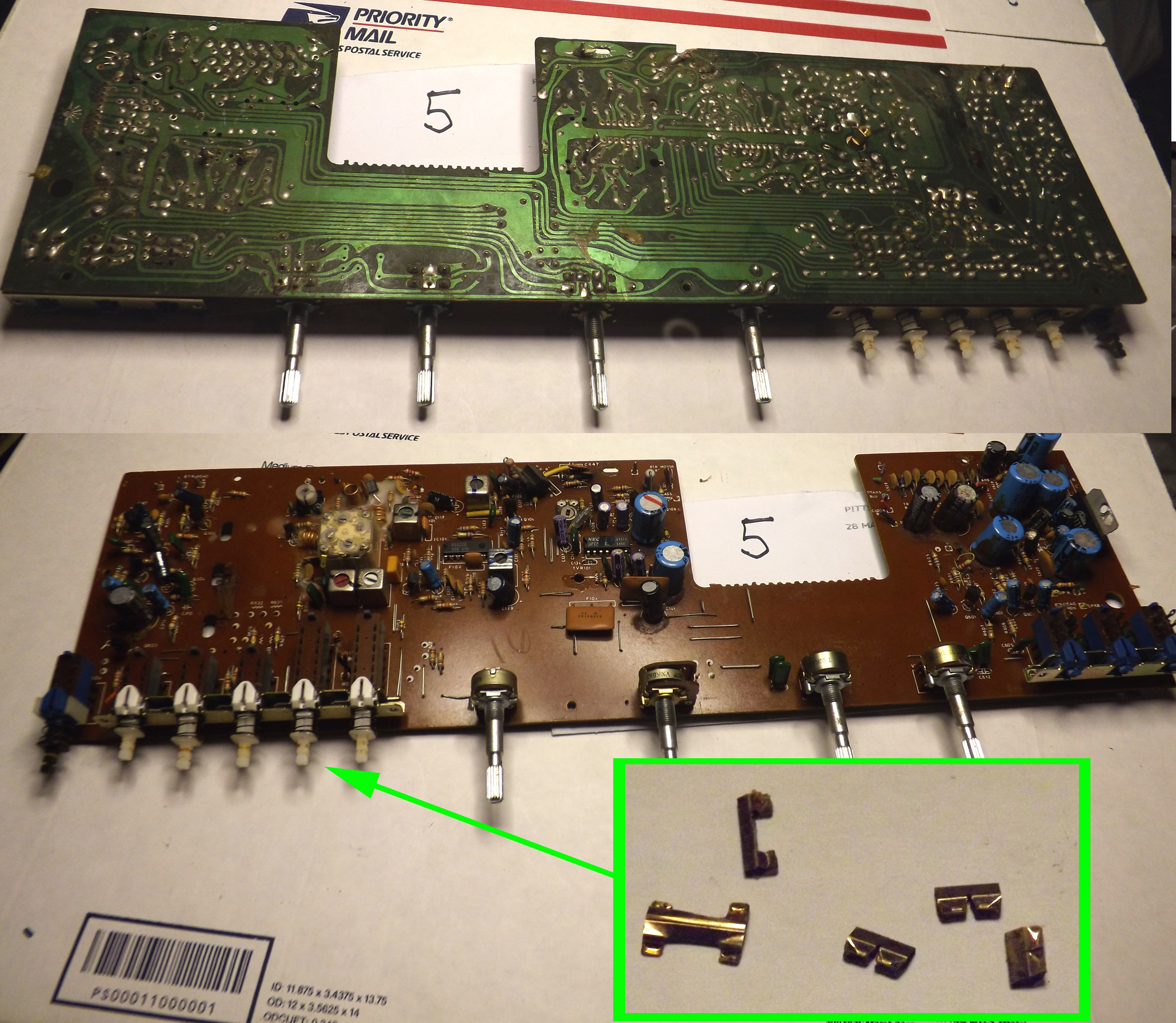 5.)Old stereo equipement. I'm guessing low or mid grade board. I've read about swithes having gold plated contacts and the cutout shows some that came from switches elsewhere on the stereo. Do these go as gold plated pins? And would leaving the switches alone be preferable for boardsort?