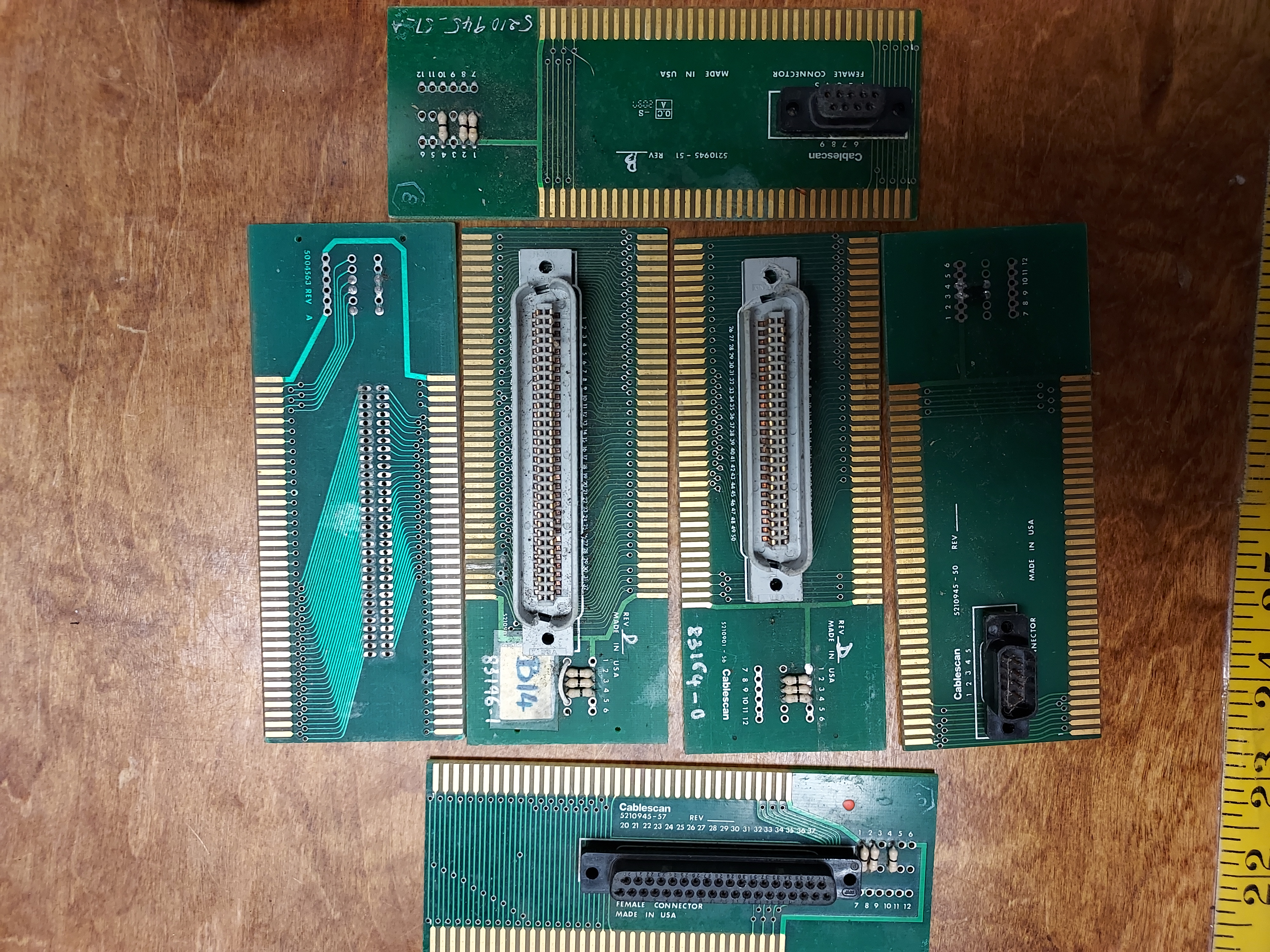 I don't think they'd be backplane (I'm leaning low peripheral myself); one doesn't even have any pins and the rest have different amounts of pins. And two of them; the gold fingers don't look like they have as much plating (could be the lighting).