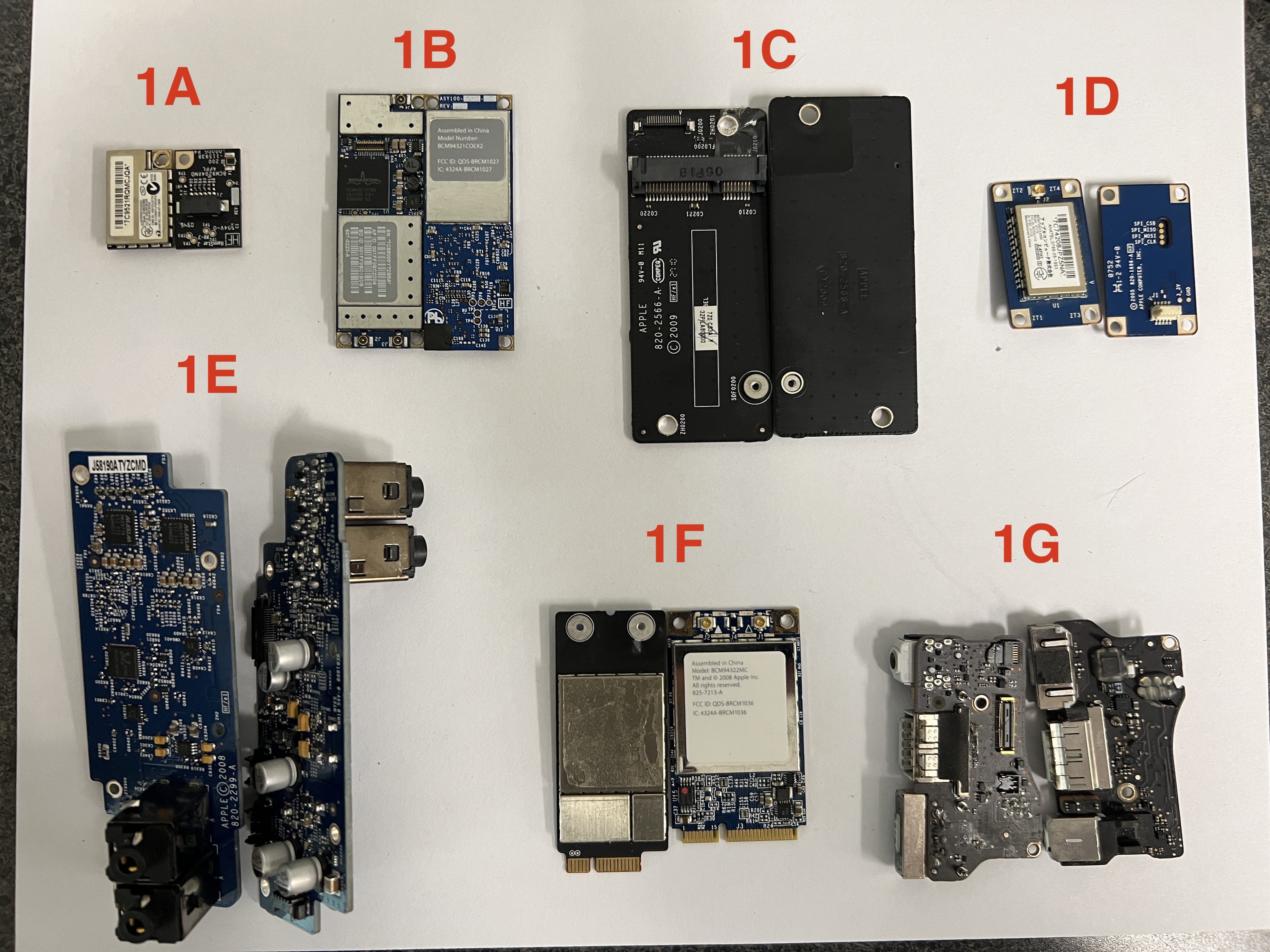 File comment: 1A: Bluetooth Card, 2009-2011 iMac 1B: WiFi/Bluetooth Card, Older MacBook Pro (shields are soldered down) 1C: M2 Slot WiFi Card Holder, 2009-2010 iMac 1D: Bluetooth Card, 2007-2009 iMac 1E: Audio Board, 2007-2009 iMac 1F: iMac Wifi Cards with soldered shields 1G: MacBook Air DC-in Boards