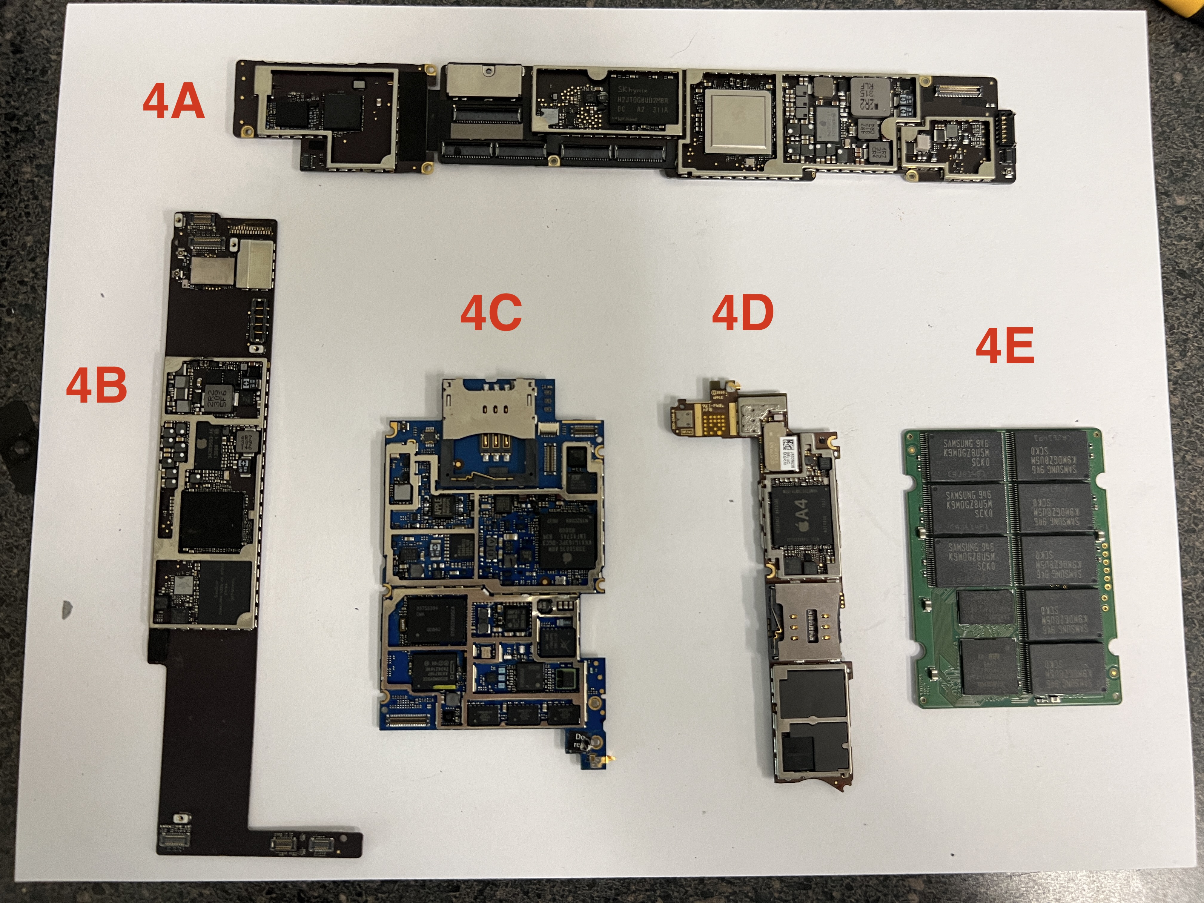 File comment: 4A: iPad logic board w/ Cellular Daughter Card 4B: iPad Logic board, WiFi only model 4C: iPhone 3G/3GS Board 4D: iPhone 4/4S/5/5S Board 4E: ZIF connector SSD (are SATA SSD boards similar?)