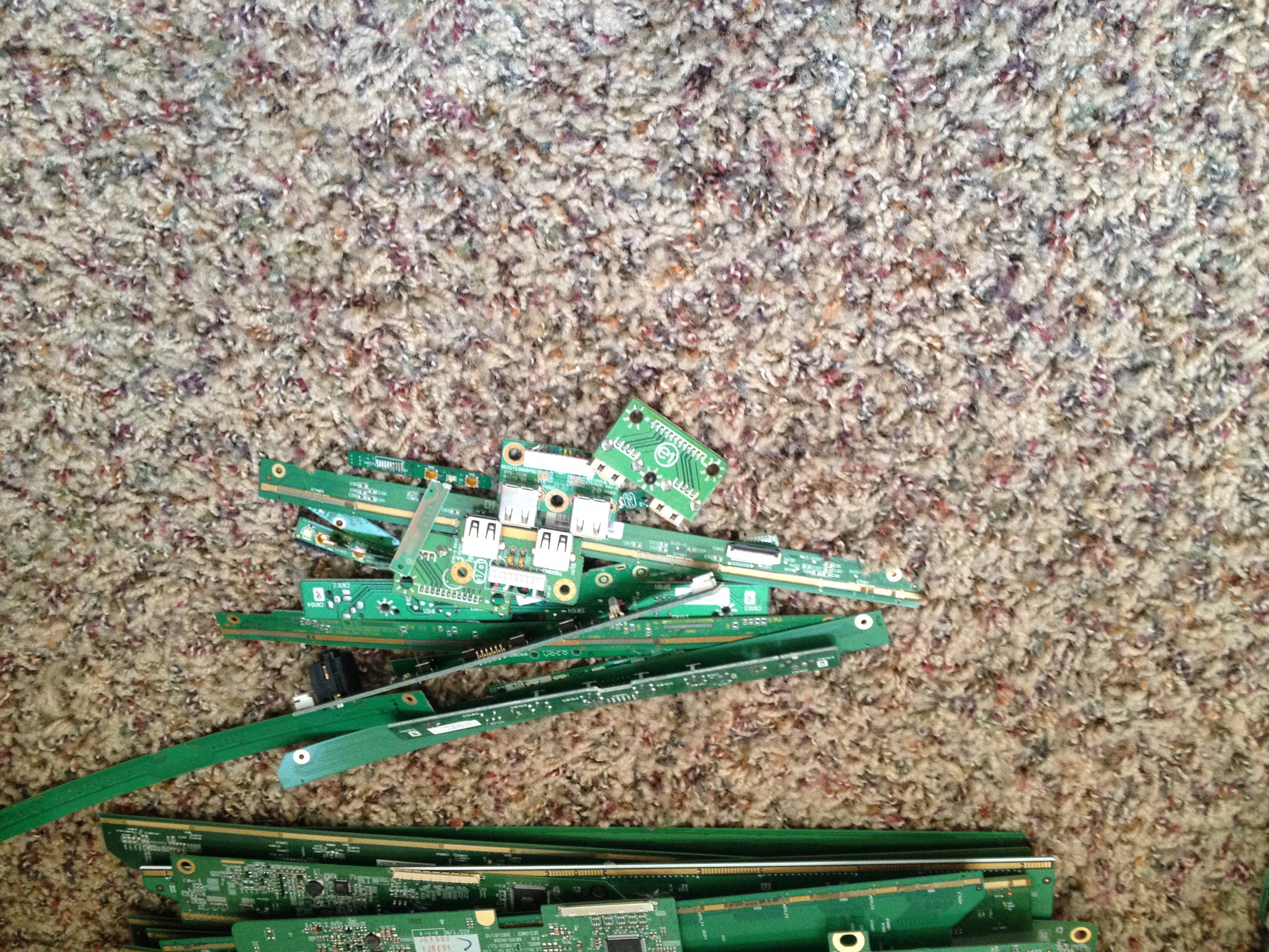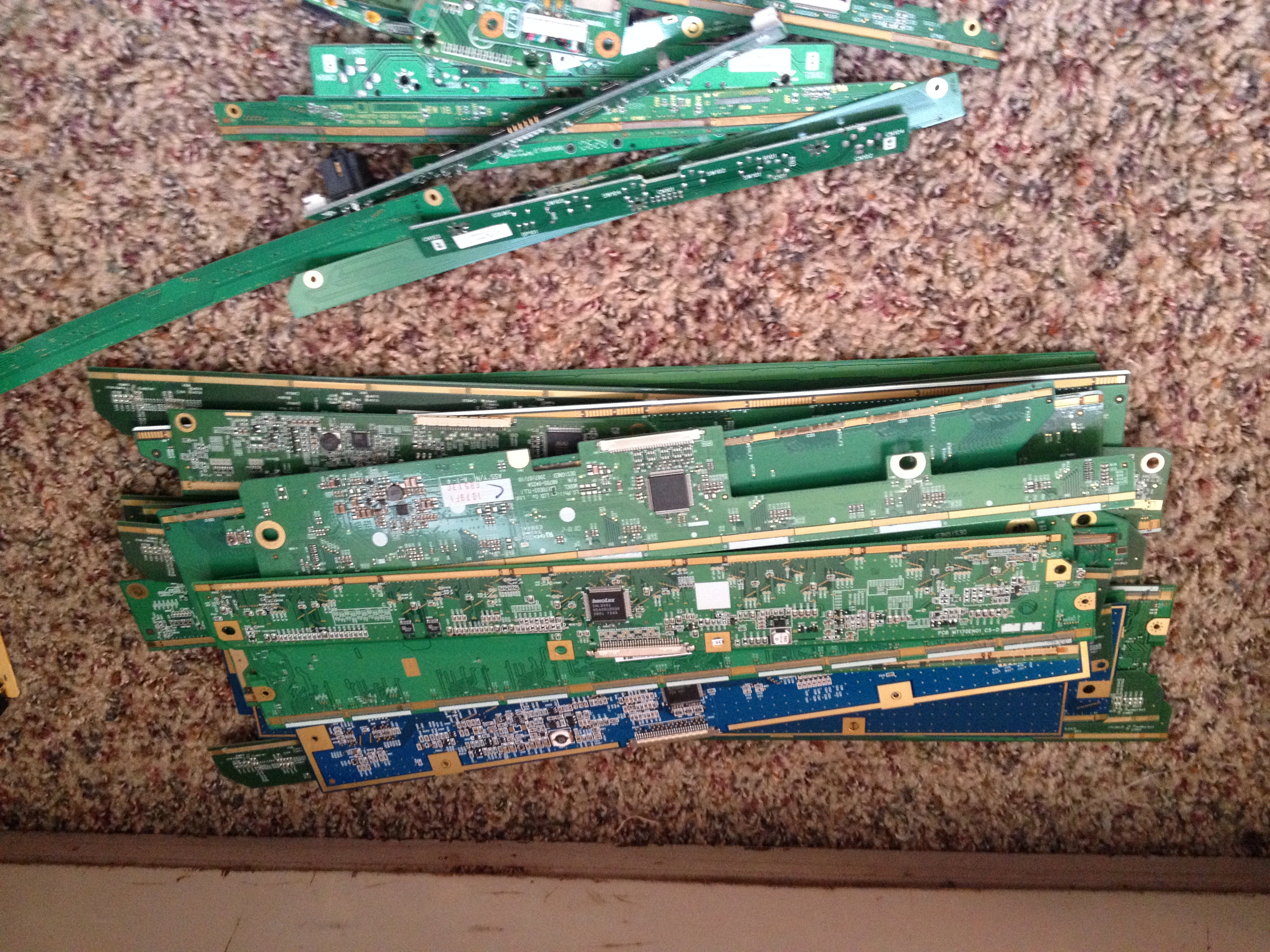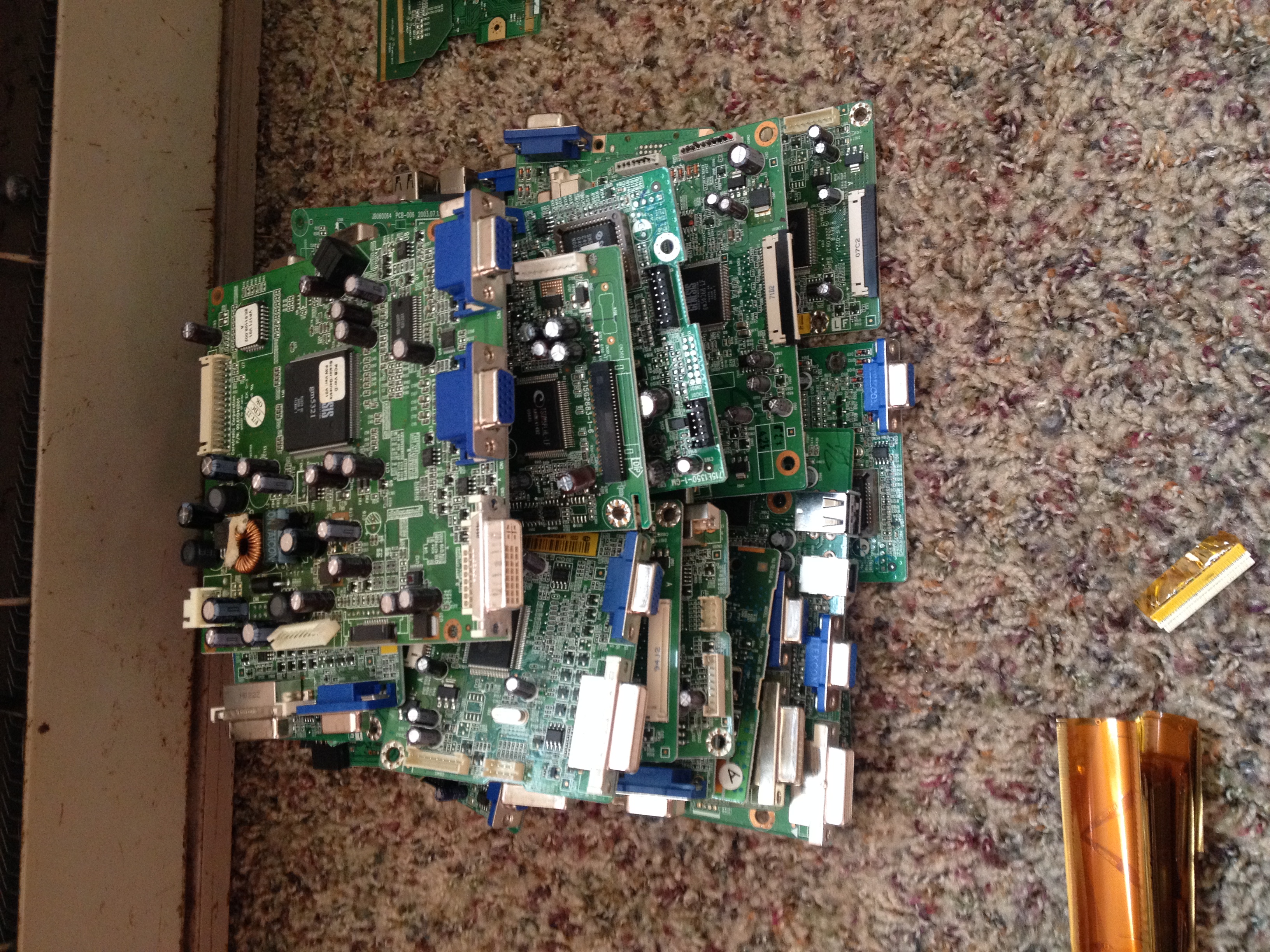 i recently scrapped out around 40 lcd monitors and was wondering what to grade certain boards at and what i could pull to increase the grades on these boards. i sorted out all of the obvious brown boards, but i some that are either mid grade or peripheral(no clue how to distinguish), and some thin boards with lots of gold plating but only a few ic type chips, lots of mlccs though. I also have a bunch of the cables that are attached to the actual lcd screens. not sure if theres any value to them or not but i have a few that are gold plated and the rest have some sort of chip on them. working on sorting out my first shipment and i want to know whats going to be worth sending in and what i should sell to my local yard( they only pay 10 cents a pound regardless of grade. ill do a little math on some of these but the low grades will not be shipped for sure. ill try take some pics in a little bit here.