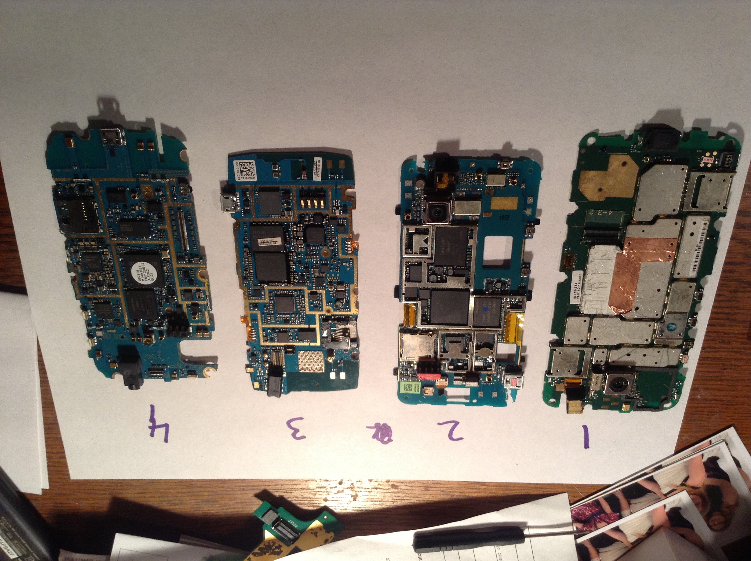 Cell phone board #1 has some RF shielding that needs to come off before it can be considered clean. I would try using a small flathead screwdriver and safety gloves to try to lift the shielding on one or two sides, then pry with some pliers to remove. You can also try a heat gun to loosen the solder, but you risk desoldering the IC chips located underneath the shielding, which will devalue the board.