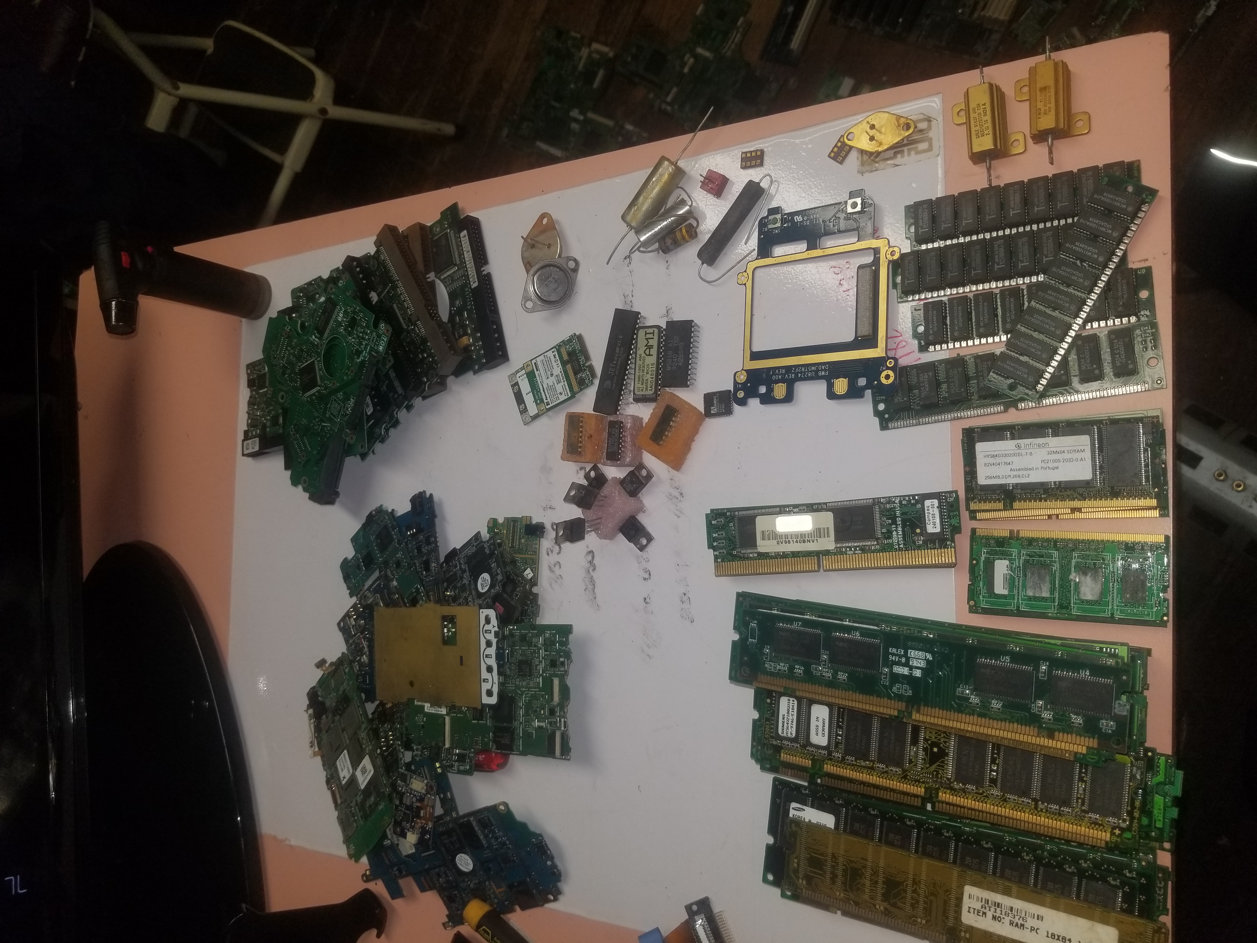 Let’s do this one photo at a time Top photo first. On the sell to us link on the top of each page you’ll find a grid in a much more logical layout than the gallery and price sheet pages. First what has classes: Top left is a bunch of cell phone boards Top right some hard drive boards Centre: the three pin pieces Boardsort doesn’t buy loose. To their right is a bunch of generic ICs that go in IC class. ICs must have 6 or more pins. The two laptop cards above the ICs will go as gold finger cards. Bottom gold finger ram and silver finger ram have their own classes. The gold flashed square board will go as peripheral. The random metalcomponents Boardsort doesn’t buy.