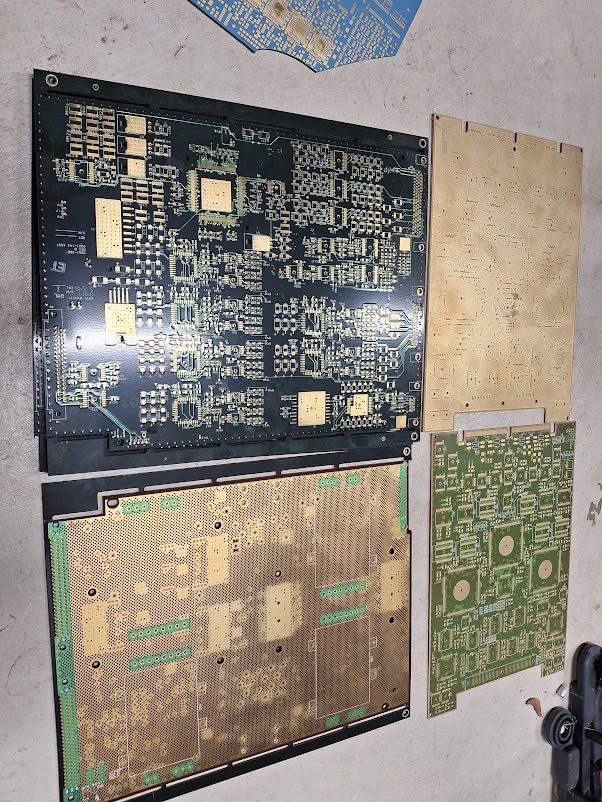 Bare, unpopulated, large gold ground plane PCBs. Very thick copper pours in them (from the heft).