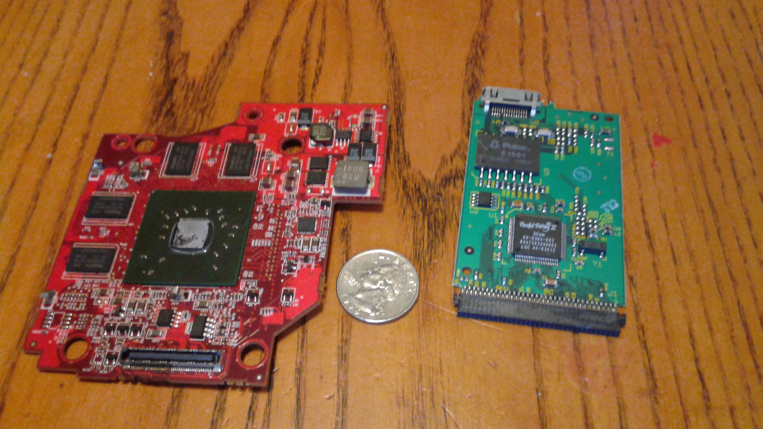 First photo red board is green fibre with metal. Green board is peripheral.