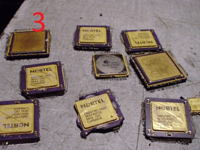 Nortel CPU's were received already removed from their boards. All have gold top and bottoom except for the odd one in the center only has gold bottom.