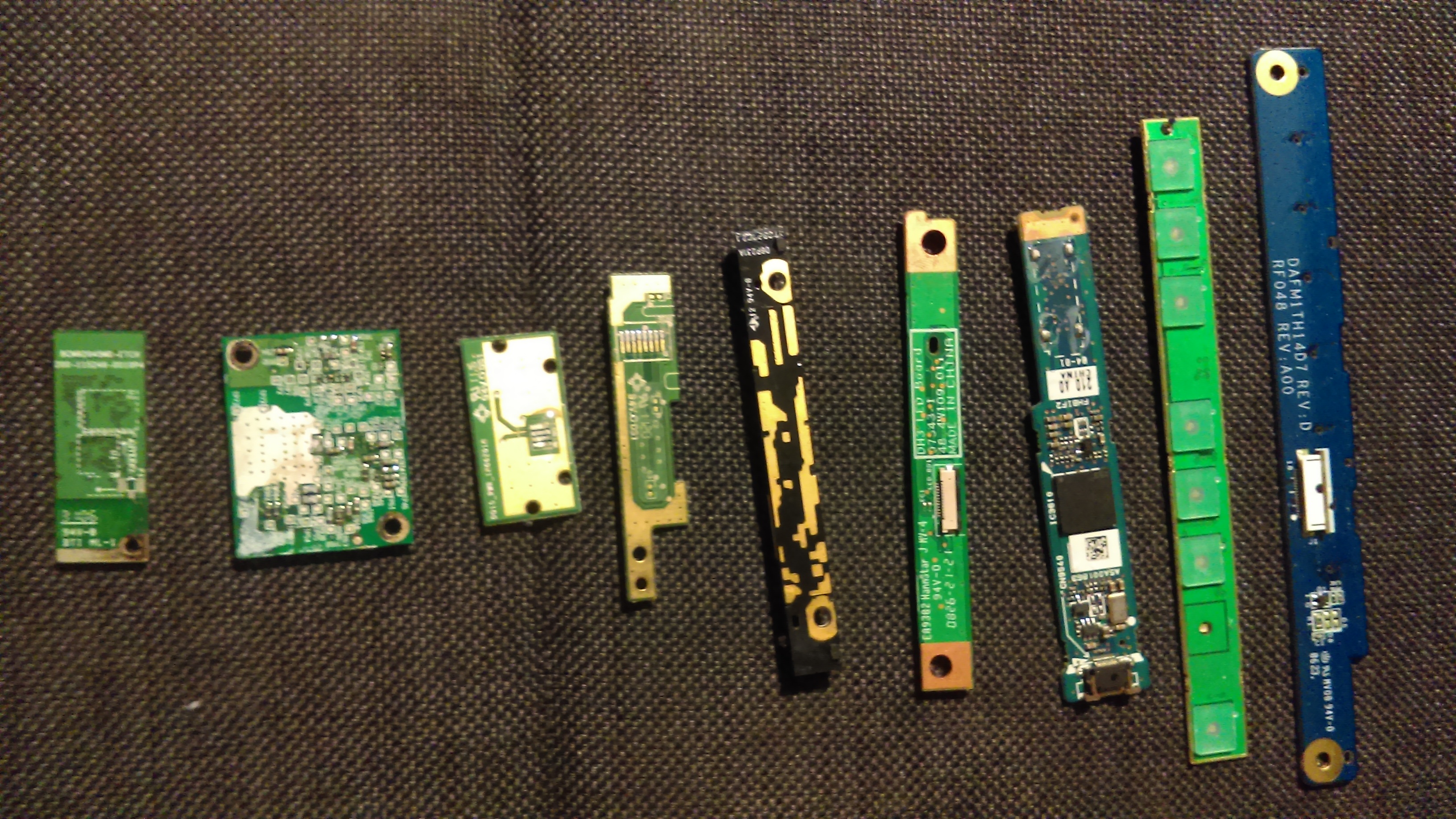 3rd 4th and 5th from the right are peripheral grade. Rest looks telco. Generally only the main boards from cell phones will clear the cell phone board rate. And a few of those aren't from cell phones. A 3g card in there and some pda stuff it looks like.