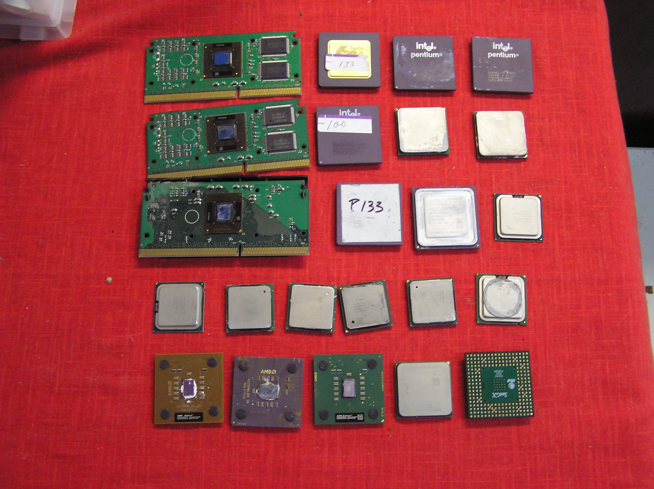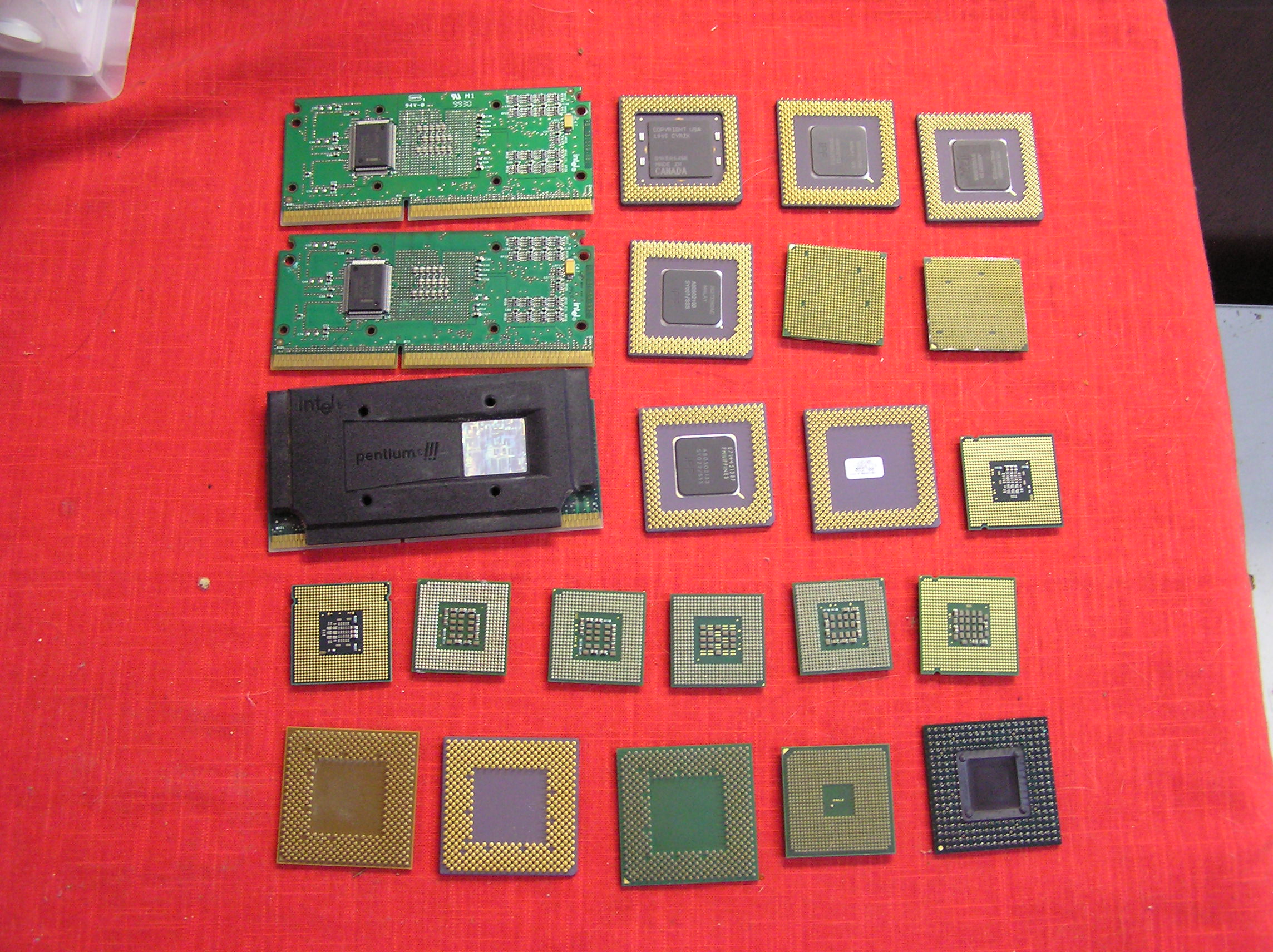First and second pictures: -First row from top, left to right: Slot processor, Cyrix chip, Pentium/mac ceramic and pentium/mac ceramic -Second row from top: slot processor, Pentium/mac ceramic and green/brown fiber with metal -third row from top: slot processor (remove the cover), Pentium/mac ceramic, AMD aluminum top and no pin processor -fourth row from top: They seems to be no pin processors - last row from top: green/brown fiber, AMD ceramic, green/brown fiber, it looks like a no pin processor and probably green/brown fiber