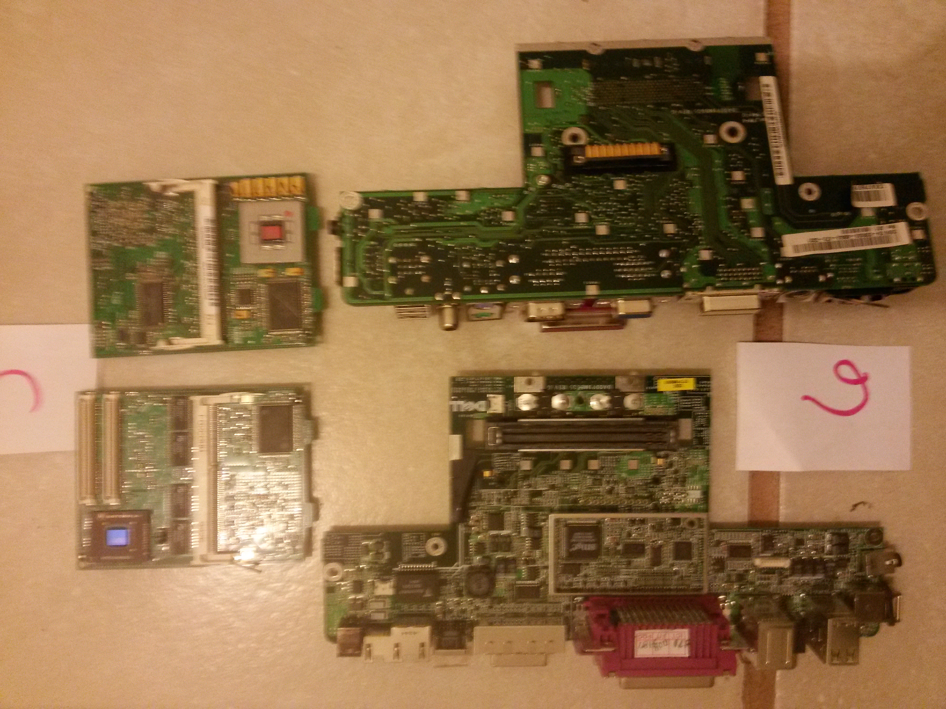 for boards 1 and 7, can we get photos of the boards individually and in better focus. If using a smartphone camera, it helps to have as much light in the room as possible, or take the boards outside and photograph them in daylight. Both appear to be motherboards, but we would need to see them clearly to determine which motherboard grade they fall in.