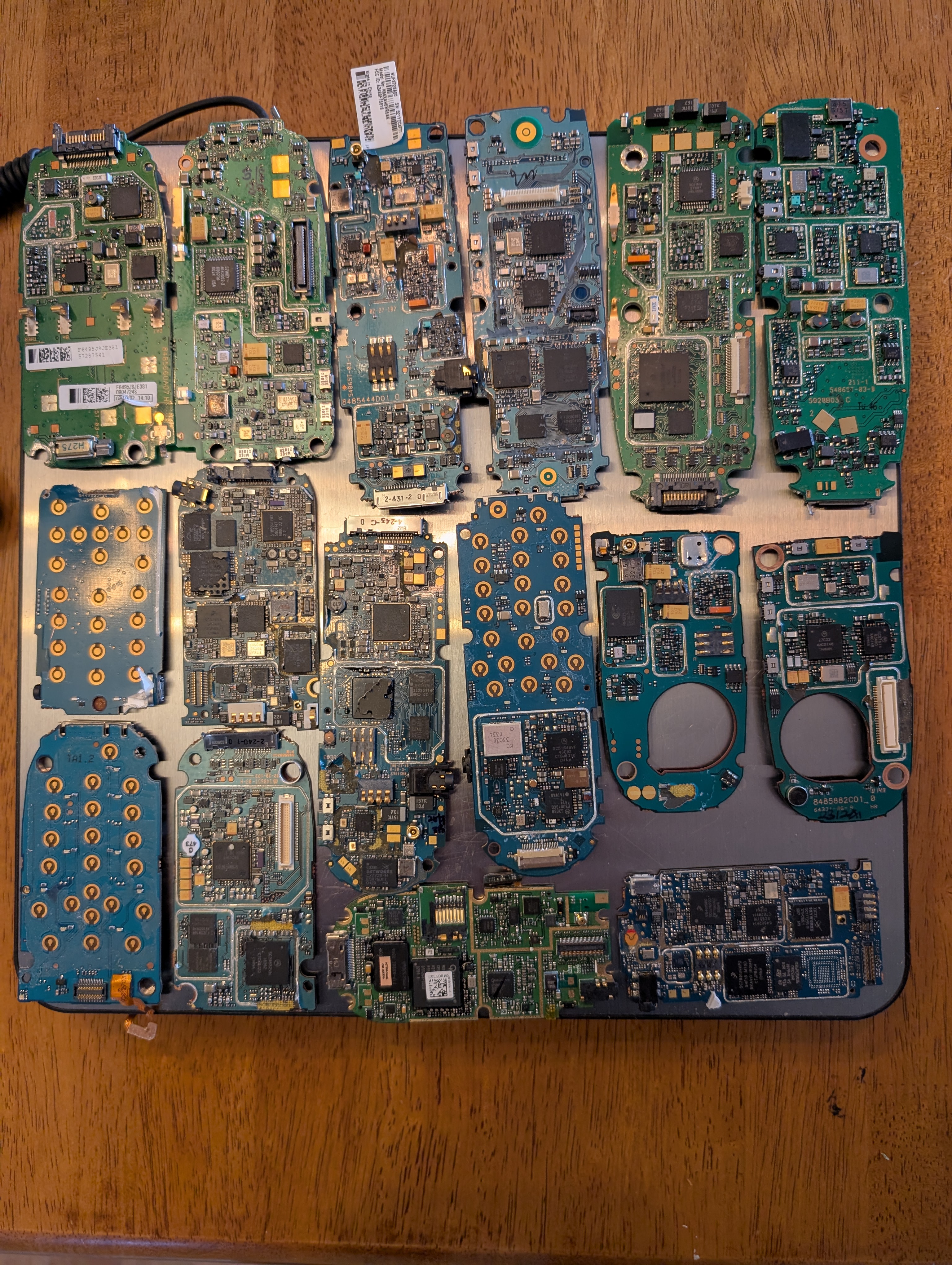 Wow, thanks for the knowledge dump! If you have any more information about specific items to look for (desktops, laptops, TVs; if there are any tablets or iPads with reasonable circuit boards) feel free to lay it on me (well, everyone here I suppose). In the meantime, I picked up a bunch of older Motorola phones; the i series; i35 up to i1000plus; 2003-2006 roughly. 32 phones yielded just under 2lbs. Even with all of the information you gave, it was still difficult to determine how old the phones were until I actually had them in hand. I attached a picture of some of the circuit boards. Since there were duplicates I was able to put two of the same thing next to each other showing the front and back. As you can see, there are a lot of gold bits gold rimmed capacitors some tantalums, etc... but the boards themselves for the most part were fairly unimpressive. I'm also including picture of about 20 g or so of gold plated material that was not part of the boards. Looking at the image of the circuit boards, do you think they could be worth any more than the per pound board sort price?